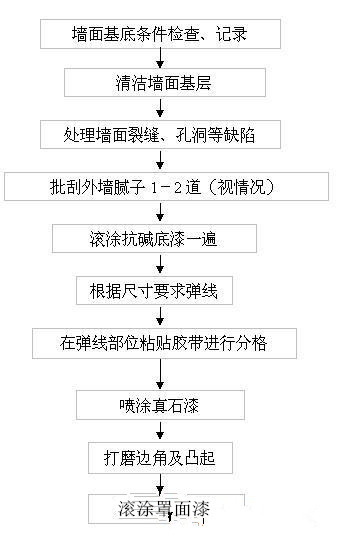 “三分涂料 七分施工”,建筑涂料質(zhì)量的優(yōu)劣,除了與涂料本身質(zhì)量的好壞有關(guān),還與施工技術(shù)水平有很大關(guān)系。為了保證建筑外墻涂料真石漆的施工質(zhì)量,必須要有正確的施工工藝和正確的施工方法,并要求施工人員嚴(yán)格按工藝要求進(jìn)行施工。