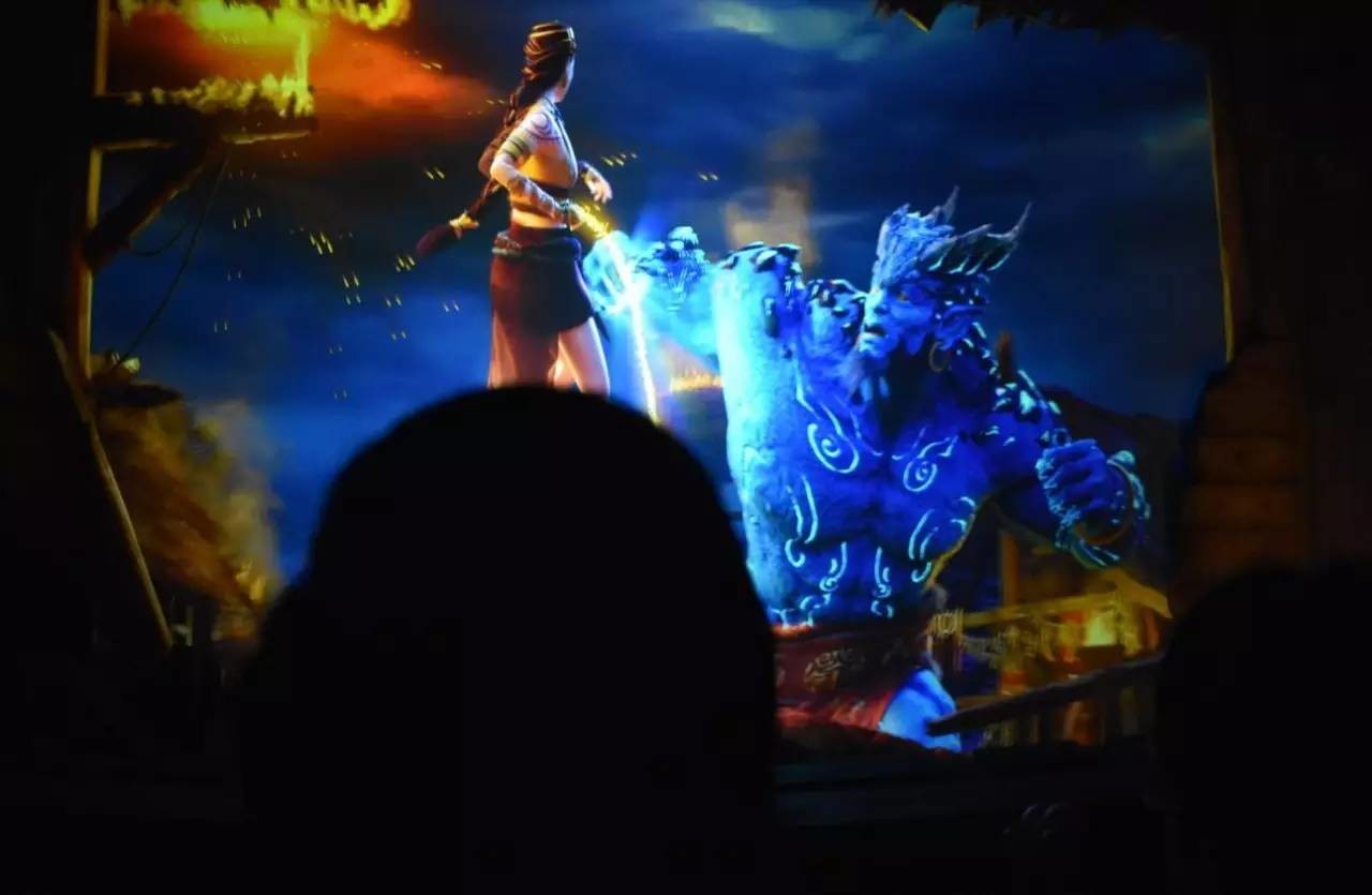 決戰(zhàn)金山寺,其實(shí)就是根據(jù)《白蛇傳》中白娘子水漫金山寺的故事改編的,走進(jìn)去后,我們先登上了一艘船,然后一路穿行過小橋流水,河道兩岸還有超級(jí)逼真的人物剪影,仿佛真的在許仙和白娘子生活的地方穿行??!到了最后決戰(zhàn)的那一刻,“霧草”,辣么大的水,辣么炫的技術(shù),如果不是有防護(hù),真心覺得自己是不是就要被白娘子淹了。